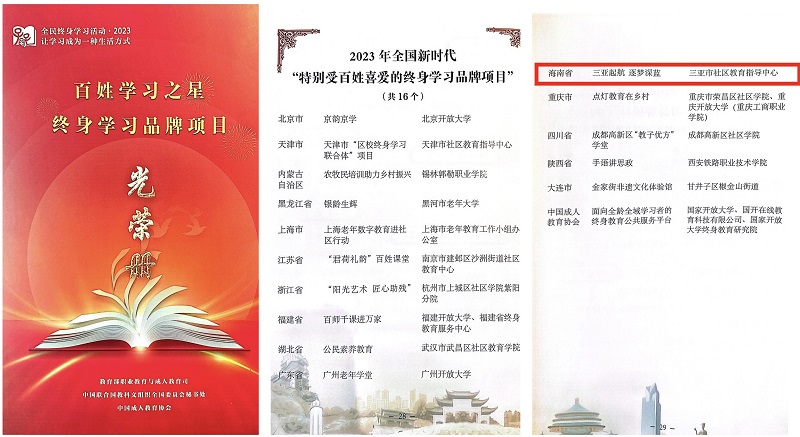 三亚市社区教育指导中心(365英国上市公司)联合三亚市教育局、365英国上市公司团委共同申报2023年全国新时代“终身学习品牌项目”。经省教育厅推介、教育部职成教司评审,我校海洋科普教育品牌《三亚起航 逐梦深蓝》荣获2023年全国新时代“特别受百姓喜爱的终身学习品牌项目”,是全国16个获此殊荣的品牌之一。此案例还列入《新时代社区教育案例•百选》。