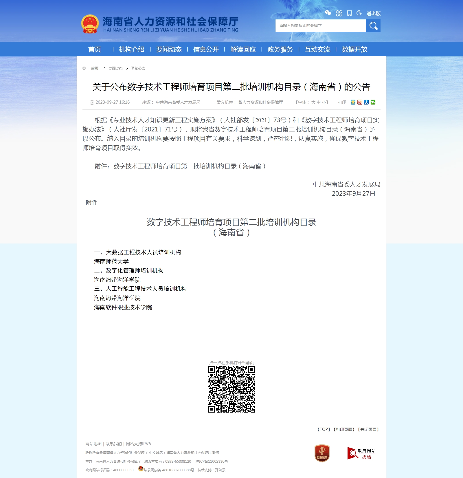 为贯彻落实党的二十大精神和习近平总书记关于做好新时代人才工作的重要思想,抓住数字经济发展的重要机遇期,加快数字技术人才自主培养,为国家、为社会、为产业培养人才,发挥高校数字技术人才培养示范引领作用。我校继续教育学院根据《专业技术人才知识更新工程实施方案》(人社部发〔202173号)和《数字技术工程师培育项目实施办法》(人社厅发〔202171号)文件精神,按照中共海南省委人才发展局《关于开展数字技术培育项目第二批培训机构和评价机构申报工作的通知》文件要求,积极主动申报,经过精心准备并上报申报材料,省委人才发展局经审核、论证、评议,并组织专家现场考察。现已批准我校为数字化管理师培训机构和人工智能工程技术人员培训机构,列入数字技术工程师培育项目第二批培训机构目录。